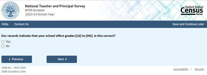 If the respondent answers “No,” indicating that the grade range on file is incorrect, questions asking for the lowest and highest grades offered at the school appear on the page.
