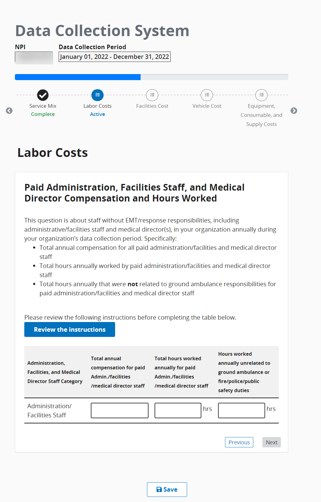 Before you input any data related to Paid EMT/Response Staff compensation, be sure to click Review Instructions and read them carefully.