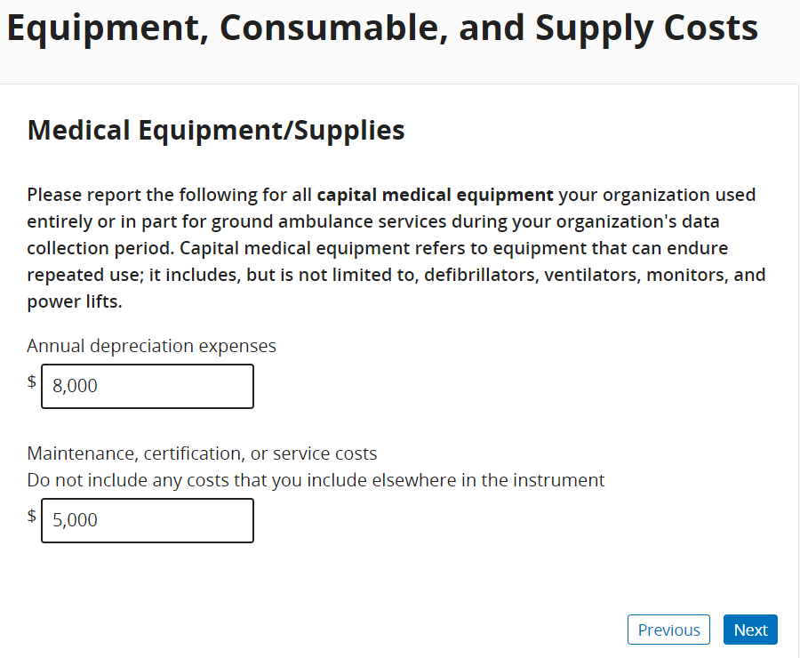 Once you’ve completed entering information about ground ambulance vehicle costs, you will be asked about your organization’s non-ambulance vehicles.