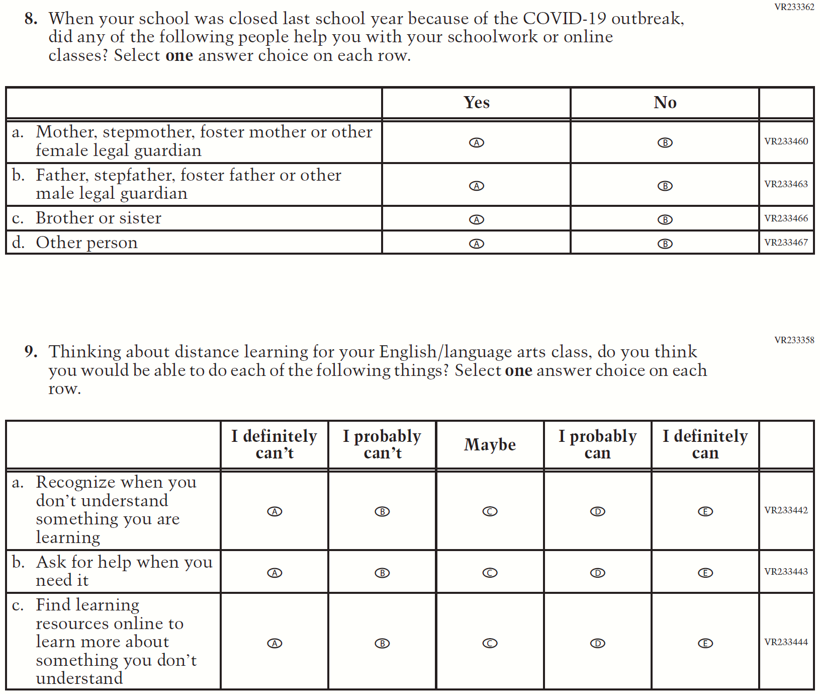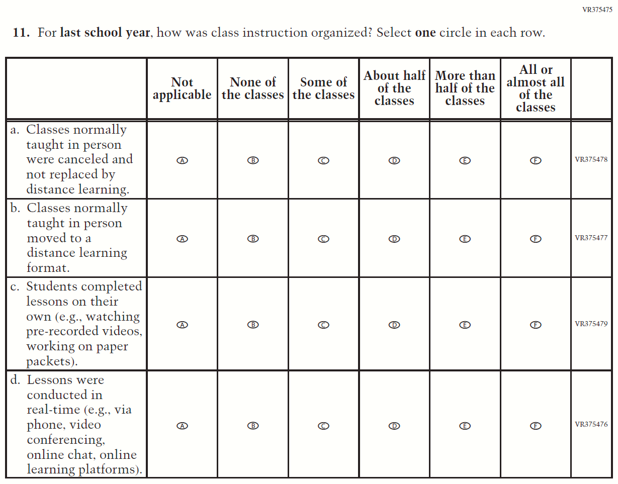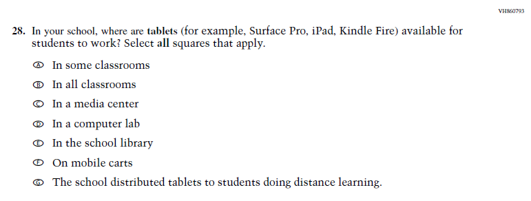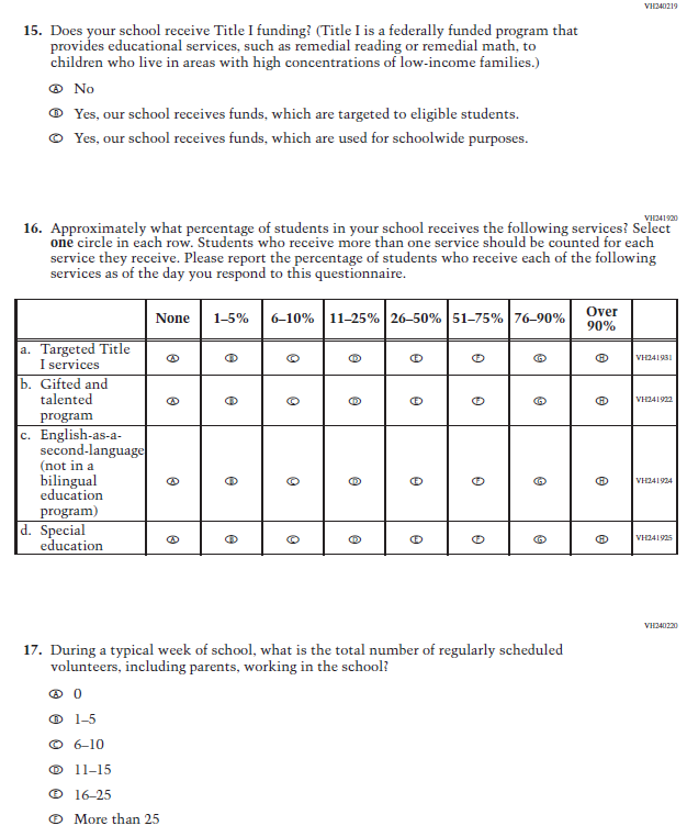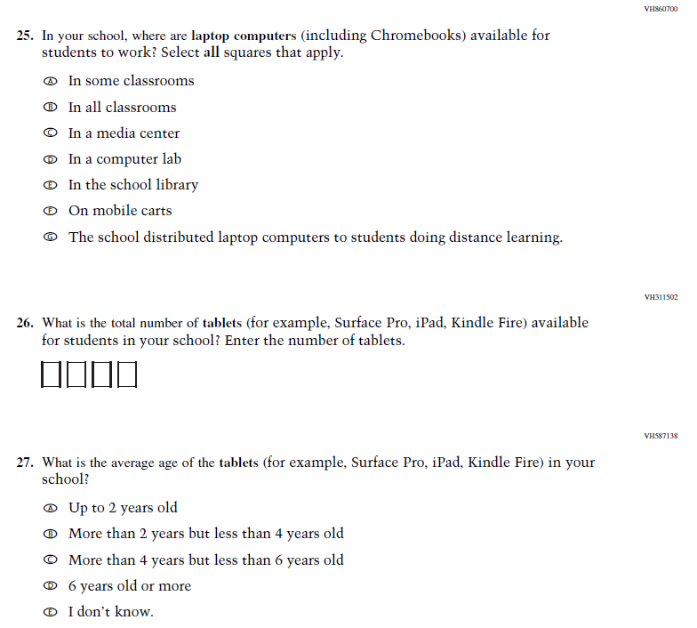 This Appendix F provides the library of previously cleared items that may be used in the NAEP 2024 questionnaires. Non-substantive wording changes to the questionnaire items (based on ongoing and future cognitive and pilot testing results), if any will be made, along with the final selection of which items will be used in the final versions of the NAEP 2024 questionnaires, will be provided as outlined below. The number of items selected for each type of respondent will be appropriate to the allocated time (as indicated in the Supporting Statement Part A section A.12).