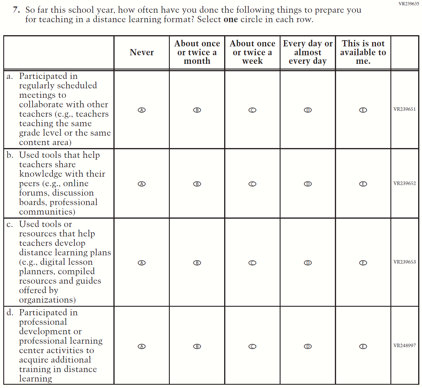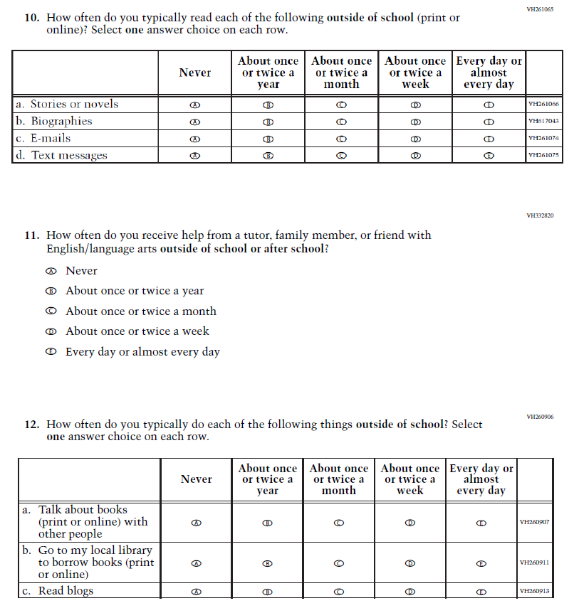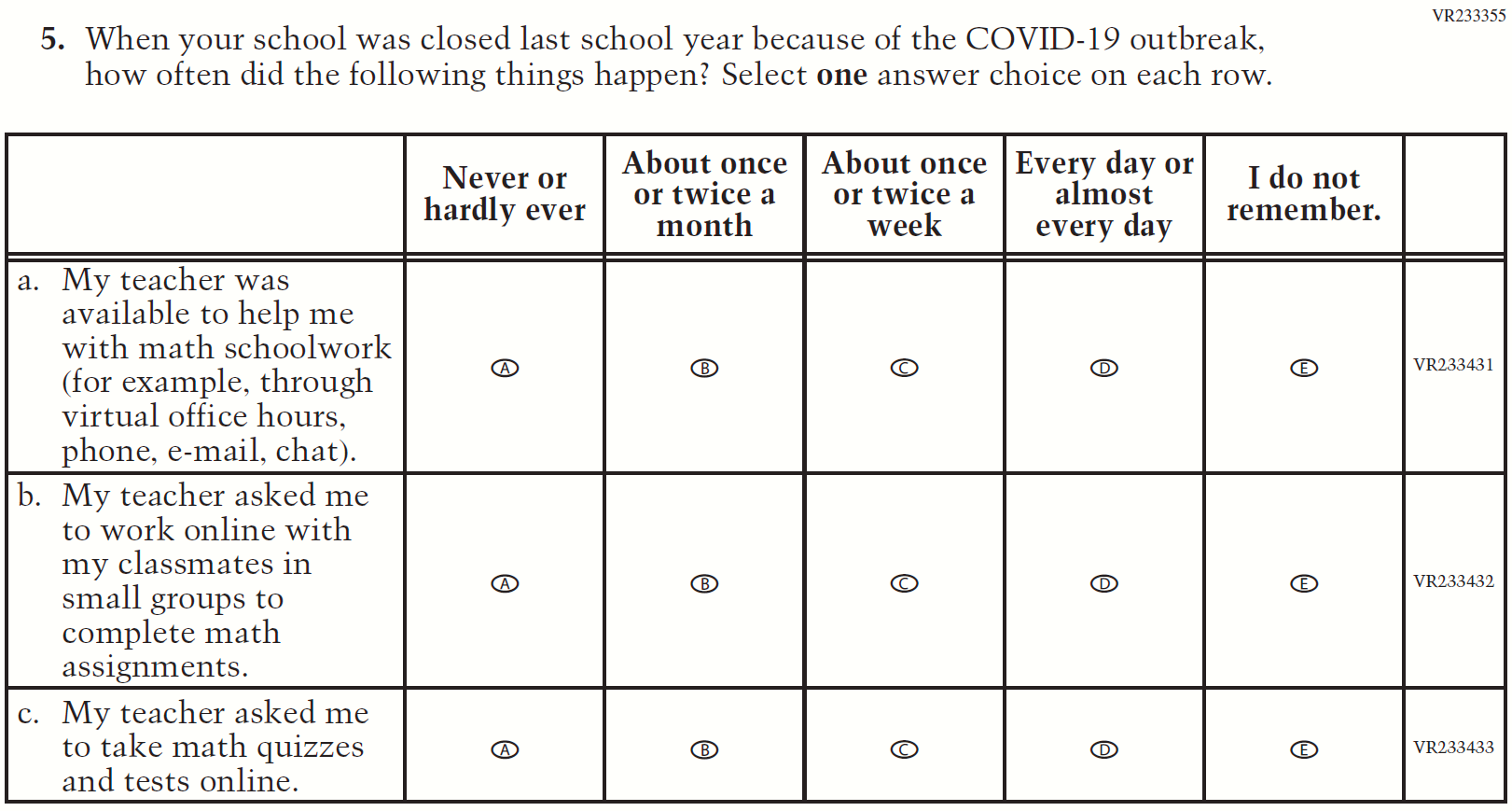 This Appendix F provides the library of previously cleared items that may be used in the NAEP 2024 questionnaires. Non-substantive wording changes to the questionnaire items (based on ongoing and future cognitive and pilot testing results), if any will be made, along with the final selection of which items will be used in the final versions of the NAEP 2024 questionnaires, will be provided as outlined below. The number of items selected for each type of respondent will be appropriate to the allocated time (as indicated in the Supporting Statement Part A section A.12).