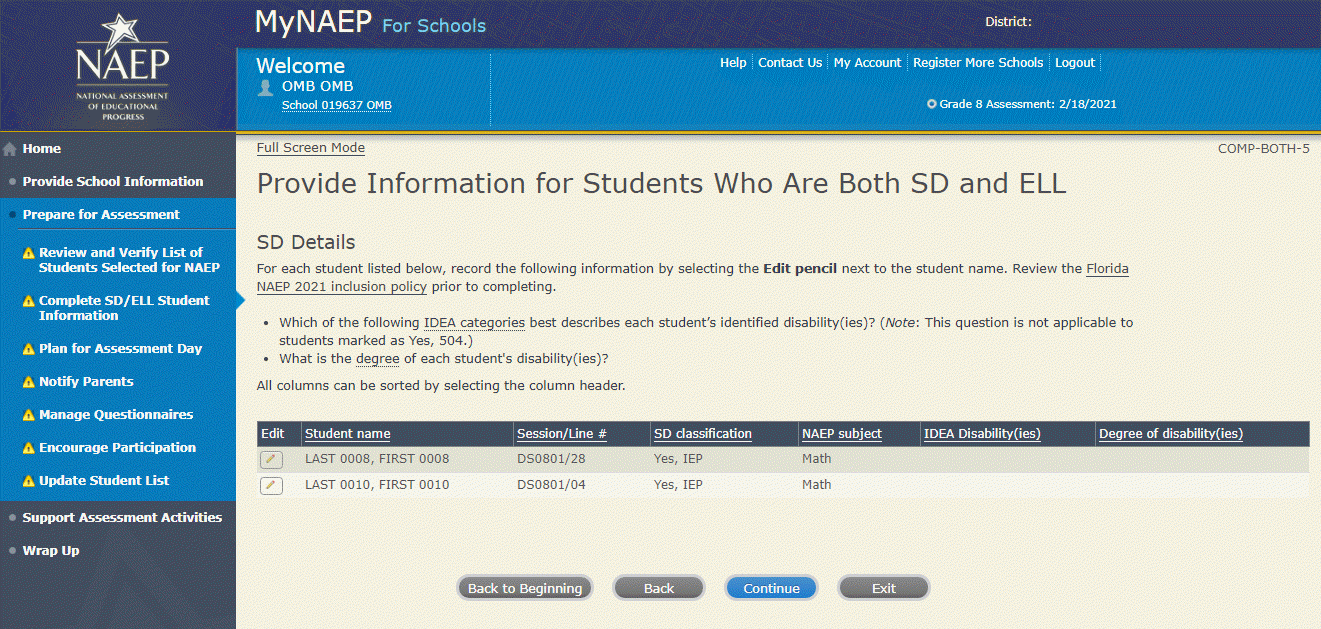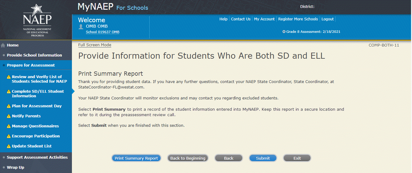According to the Paperwork Reduction Act of 1995, no persons are required to respond to a collection of information unless it displays a valid OMB control number. The valid OMB control number for this voluntary information collection is 1850-0928. The time required to complete this information collection is estimated to average 270 minutes for schools that do not submit student sample information or 390 minutes for schools that submit student sample information manually, plus an additional 10 minutes for each student identified as SD or ELL, including the time to review instructions, search existing data resources, gather the data needed, and complete and review the information collection. If you have any comments concerning the accuracy of the time estimate, suggestions for improving this collection, or any comments or concerns regarding the status of your individual submission, please write to: National Assessment of Educational Progress (NAEP), National Center for Education Statistics (NCES), Potomac Center Plaza, 550 12th St., SW, 4th floor, Washington, DC 20202.