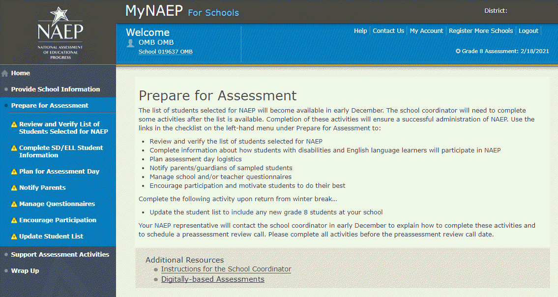 Description of MyNAEP: The school coordinators are responsible for preparing for the assessment in their school using the MyNAEP system, which is an online secure site that provides participating schools with a convenient way to prepare for the upcoming assessment. MyNAEP serves as the primary resource and action center throughout the assessment process. The site also offers school coordinators an electronic way to prepare for the assessment at their own pace. The NAEP field representative will schedule an initial call in December to pre-review the major areas of the MyNAEP system with the school coordinator. A description of the tasks completed in the MyNAEP system can be found in Part B. The content of the MyNAEP system is included in this appendix.