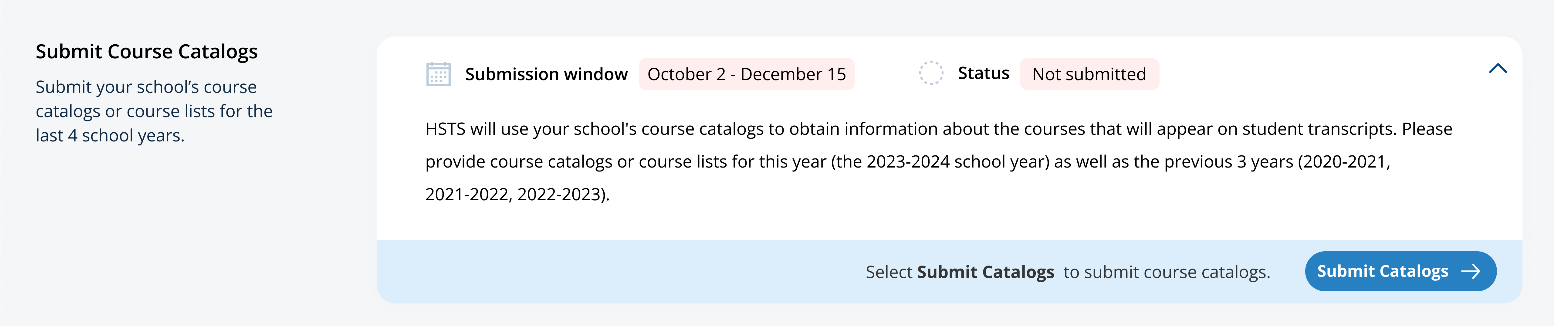 Schools and districts will access the Submit Course Catalog page by selecting “Submit Catalogs” on the HSTS Main Page Submit Catalog tile.