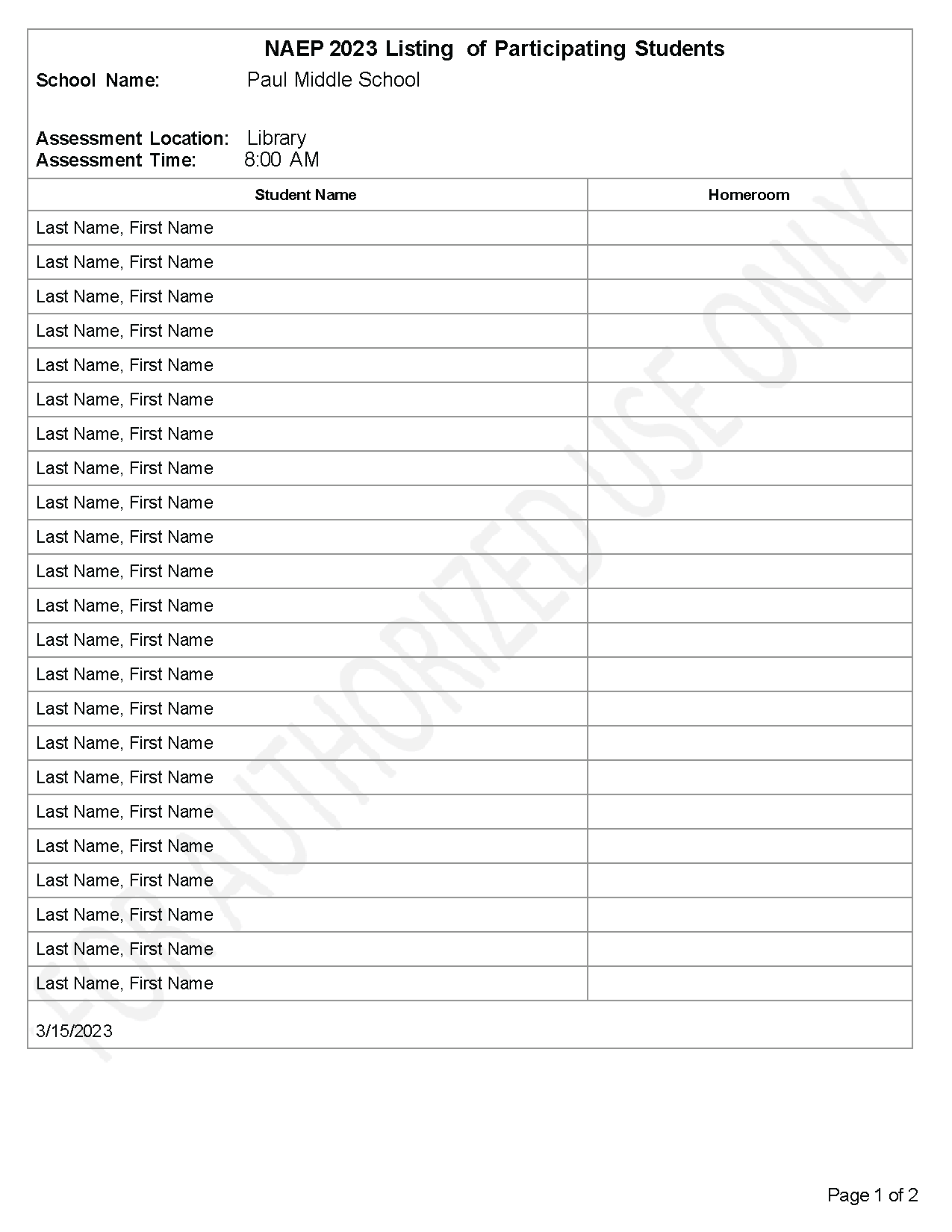NAEP needs a complete Excel file of students enrolled during the 2023–2024 school year for the selected grade(s) at your school. Schools selected for multiple grades should create separate files for each grade. NAEP uses this student list to draw a random sample of students to participate in the assessment. Include all students in the selected grade, even students who are typically excluded from other testing programs, such as students with IEPs (SD) and English Learners (EL), and students participating in virtual/remote learning.
