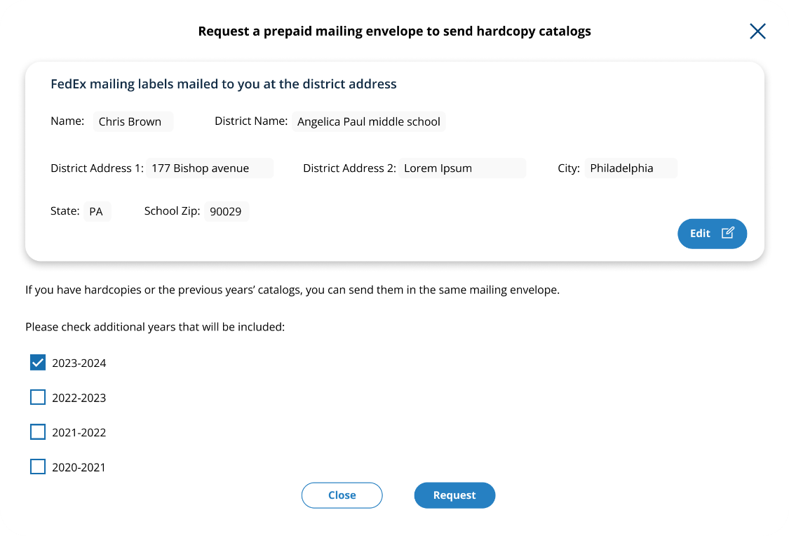 This pop-up window allows schools and districts to update the address information if needed for the pre-paid mailing envelope. The school/district can also indicate what years they plan to send in the envelope. When they submit, the school will see a confirmation message in another pop-up.