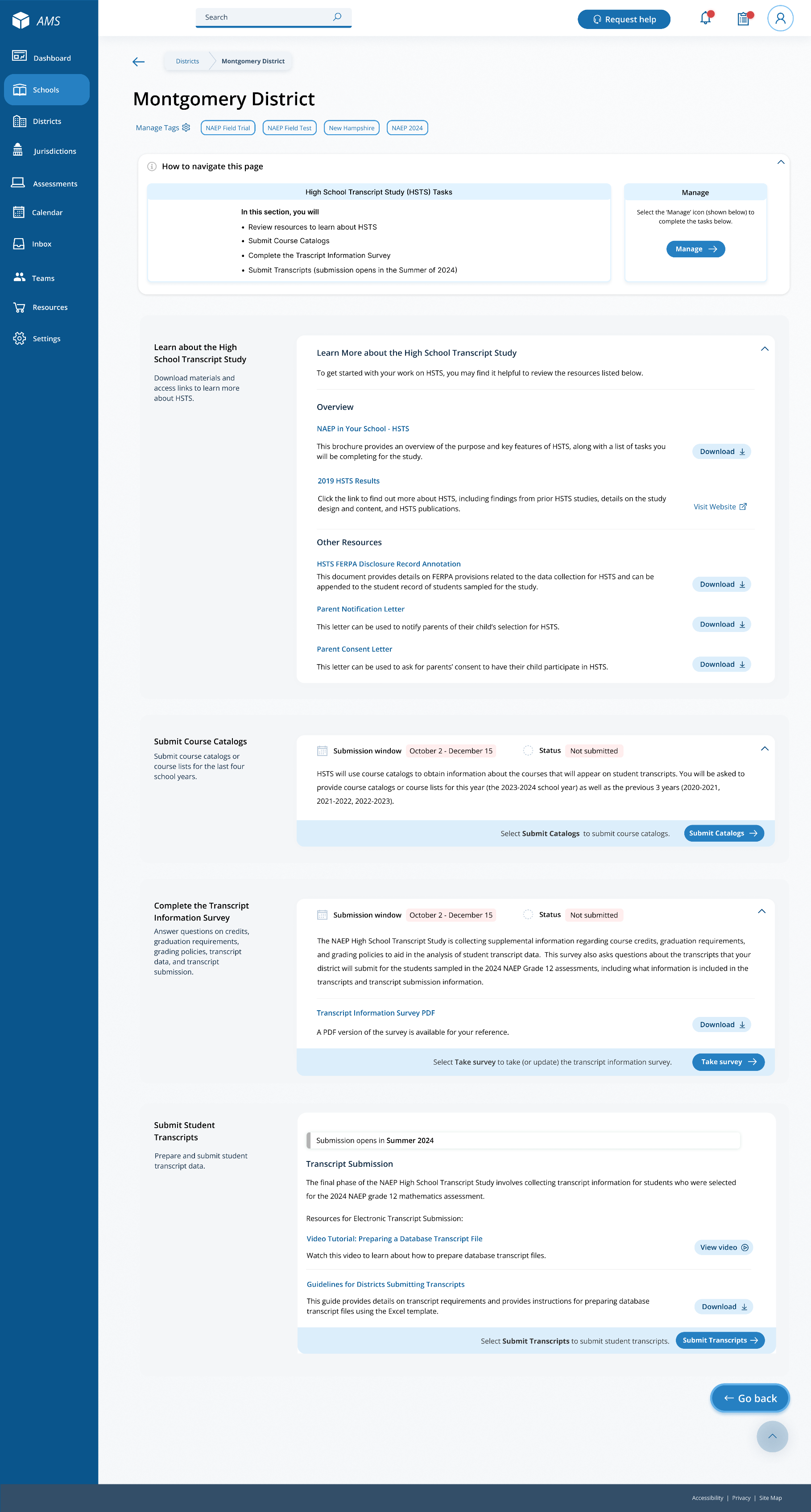 The next section “Learn about the High School Transcript Study” has a list of resources to download and links to the NAEP HSTS website for more information. Parent/Guardian Letters will also be posted in this section if requested. This tile is identical for schools and districts.