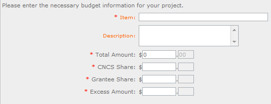 Below are the instructions for each line item of the budget form. For each line item, you will have to document the CNCS Share, Grantee Share, and the Excess Amount.