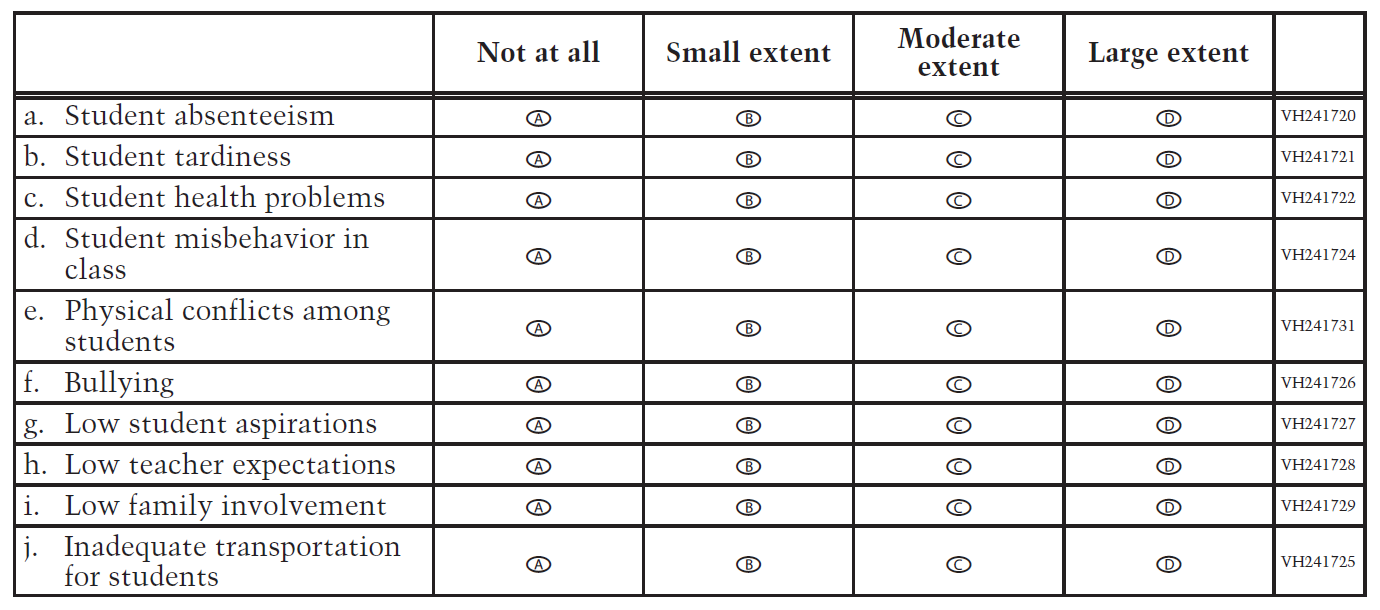 27. To what extent is each of the following a problem in your school? Select one circle in