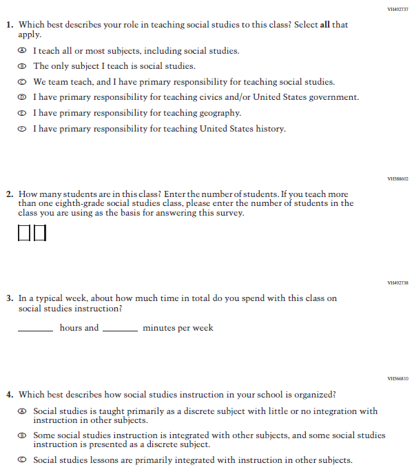 Appendix F includes the core and subject specific survey questionnaires for students, teachers, and school administrators, which were approved in October 2021 (OMB# 1850-0928 v.25). The final survey questionnaires for 2024 will be included in Appendices J1, J2, J3 and J-S. System login screens and paper booklet covers will be updated in upcoming Amendments to the Clearance Package.