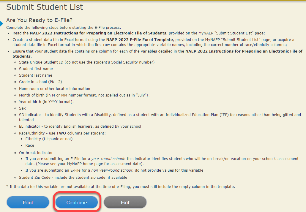We recommend that you create your student file using the NAEP E-File Excel Template, which is available on the MyNAEP website’s “Submit Student List” page. If necessary, you may alternatively provide an Excel file with the same column headers and data in a different order. If you cannot submit your student data in an Excel file, call the NAEP help desk at 1-800-283-6237.