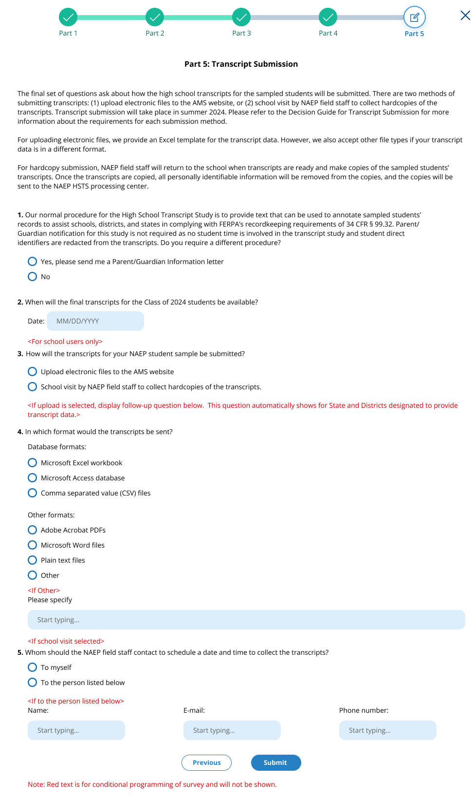 NCES estimates the time required to complete this information collection to average 270 minutes for schools that do not submit student sample information or 390 minutes for schools that submit student sample information manually, plus an additional 10 minutes for each student identified as SD or EL, plus an additional 25 minutes to complete technical activities, plus an additional 60 minutes for schools participating in High School Transcript Study (HSTS) and an additional 150 minutes for schools submitting HSTS materials electronically, including the time to review instructions, search existing data resources, gather the data needed, and complete and review the information collection. This voluntary information collection was reviewed and approved by OMB (Control No. 1850-0928). If you have any comments concerning the accuracy of the time estimate, suggestions for improving this collection, or any comments or concerns regarding the status of your individual submission, please write to: National Assessment of Educational Progress (NAEP), National Center for Education Statistics (NCES), Potomac Center Plaza, 550 12th St., SW, 4th floor, Washington, DC 20202, or send an email to: nces.information.collections@ed.gov.