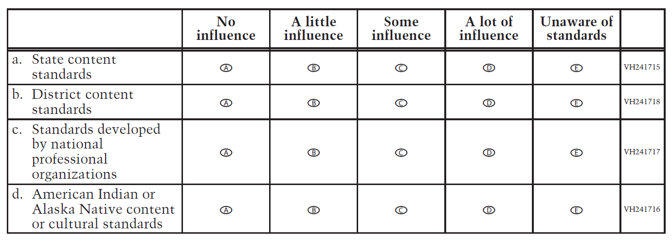 15. How much influence does each of the following standards have on your school’s