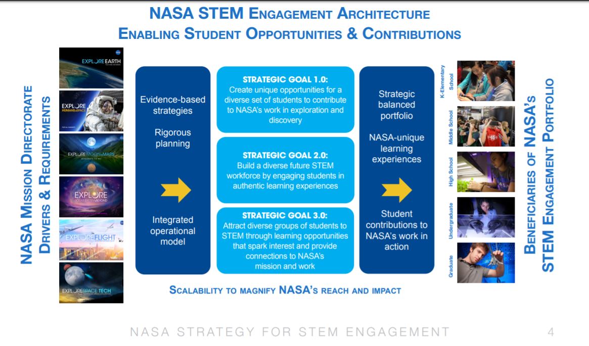 NASA has a long history of engaging the public and students in its mission through educational and outreach activities and programs. NASA’s endeavors in education and public outreach began early on, driven by the language in Section 203 (a) (3) of the Space Act, “to provide for the widest practicable and appropriate dissemination of information concerning its activities and the results thereof, and to enhance public understanding of, and participation in, the Nation’s space program in accordance with the NASA Strategic Plan.” NASA’s education and outreach functions aim to inspire and engage the public and students, each playing a critical role in increasing public knowledge of NASA’s work and fostering an understanding and appreciation of the value of STEM, and enhancing opportunities to teach and learn. By augmenting NASA’s public engagement and communicating NASA’s work and value, the Agency contributes to our Nation’s science literacy. NASA is committed to inspiring an informed society; enabling the public to embrace and understand NASA’s work and value, today and tomorrow; engaging the public in science, technology, discovery, and exploration; equipping our employees to serve as ambassadors to the public, and providing unique STEM opportunities for diverse stakeholders.