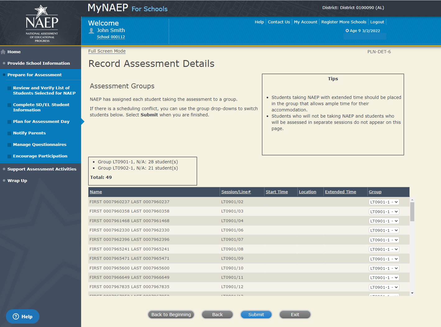 NCES estimates the time required to complete this information collection to average 270 minutes for schools that do not submit student sample information or 390 minutes for schools that submit student sample information manually, plus an additional 10 minutes for each student identified as SD or EL, including the time to review instructions, search existing data resources, gather the data needed, and complete and review the information collection. This voluntary information collection was reviewed and approved by OMB (Control No. 1850-0928). If you have any comments concerning the accuracy of the time estimate, suggestions for improving this collection, or any comments or concerns regarding the status of your individual submission, please write to: National Assessment of Educational Progress (NAEP), National Center for Education Statistics (NCES), Potomac Center Plaza, 550 12th St., SW, 4th floor, Washington, DC 20202, or send an email to: nces.information.collections@ed.gov.