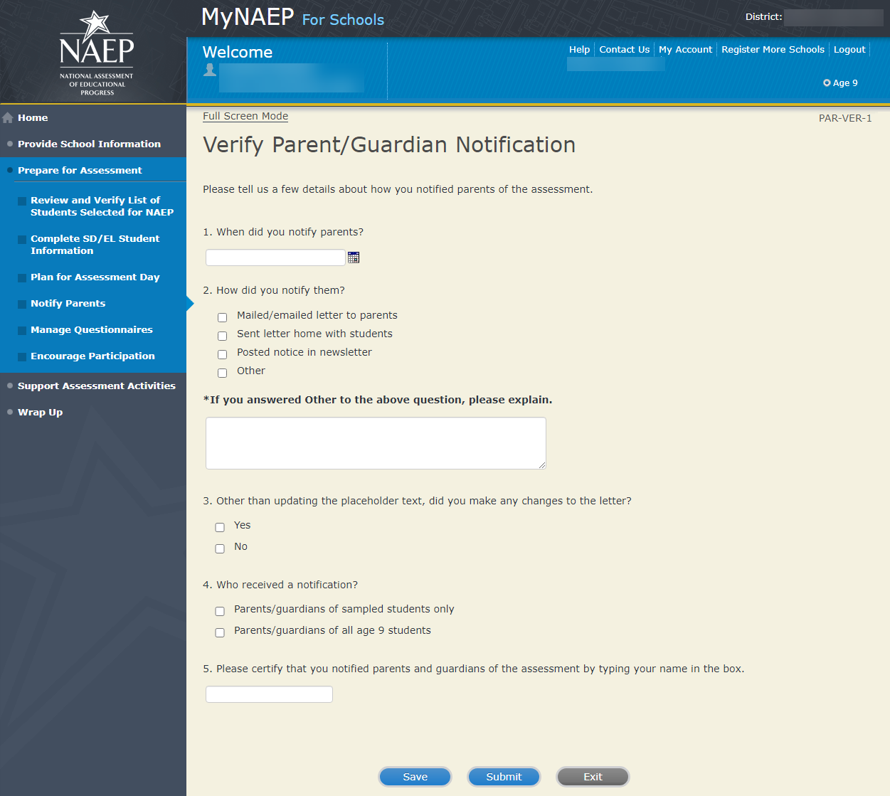 This Appendix F2 (formerly Appendix I4) was used in the 2022 Long-Term Trend Age 13 administration and reflected the MyNAEP system screens used by schools to communicate with and transmit information to NAEP. A newer version of MyNAEP, now known as the Assessment Management System (AMS), is replacing this older MyNAEP system across all NAEP assessments. NAEP is currently updating the AMS in preparation for 2025 LTT. As such, the new AMS screens are not yet available for this Clearance Package. The screens and text in this Appendix F2 will be adapted for 2025 LTT Amendment #2 and will be available for review in Appendix F in Summer 2024. See also Appendix F1 for more on the forthcoming Appendix F.