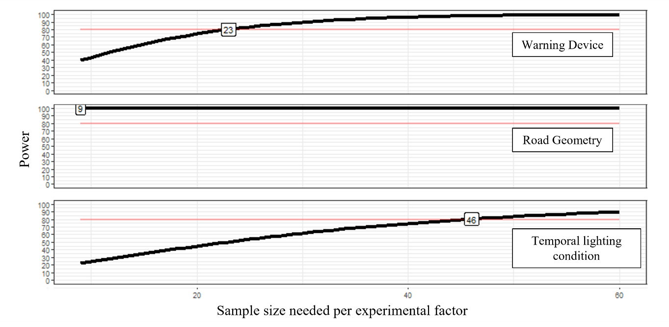 Figure 3 Power versus sample size for the presence of warning device, road geometry and temporal lighting condition. Numbers in the squares indicate the smallest sample size to achieve the desired power (80% in the present study).