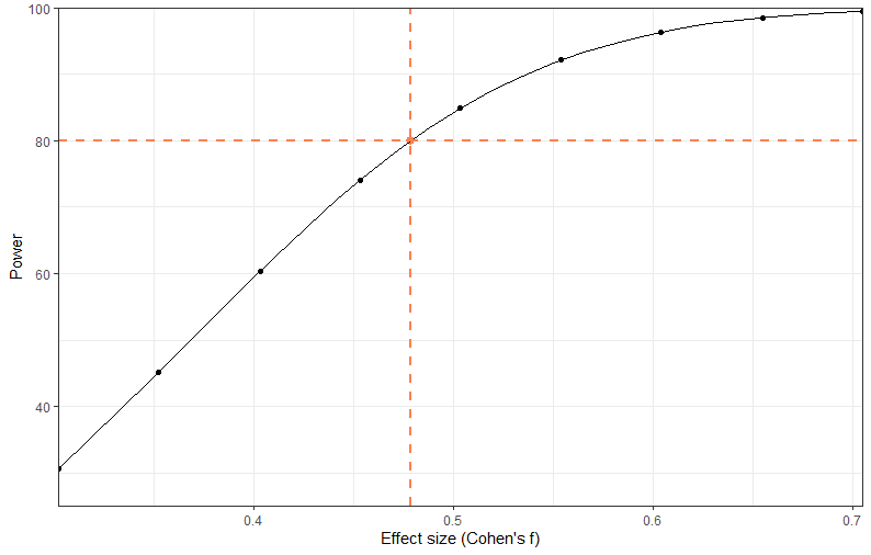 The simulation result showed that with 32 participants in each condition, the study will have higher than desired power of 80% to detect the expected effect size for the two within-subject factors, i.e., road geometry and the presence of warning triangles (See Figure 3). As for the between-subject factor, it is expected that the sample size in each condition would need a slightly larger number (46). This is expected as the expected effect size was smaller in the simulation. Further sensitivity power analysis of the temporal lighting condition shows that with 80% of power, the study will find significant effect if the Cohen’s f is greater than 0.48, see Figure 4. Note that the purpose of the study is to find a practical effect if there’s one not to dive into the smallest possible statistically significant effect, and the sensitivity power analysis provides a plausible range of effect sizes at what power level. Finally, considering the total burden hours added to the respondent, choosing 32 participants instead of 46, a total of 274.48 burden hours could be saved. See Table 2 for the comparison.