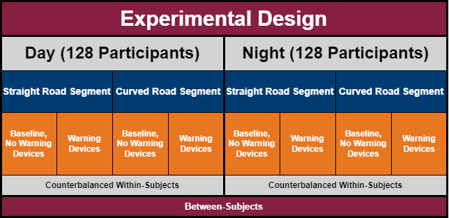 This experiment is structured as a 2 × 2 × 2 mixed-model factorial design. This study will include the evaluation of warning devices (present, absent) across two road geometry configurations (straight, curved) and two temporal lighting conditions (day, night). The final research design is full factorial, including eight potential conditions combinations for 256 participants. The warning device configuration will follow 49 CFR §392.22 guidelines.