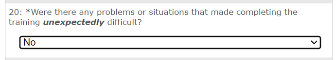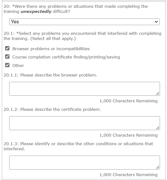 The screen capture images that follow show ALL of the questions included in the survey. Questions numbered with decimals (e.g., 20.1, 20.1.1, 20.1.2, and 20.1.3,) are only displayed when a preceding response option is selected, triggering branching display logic for the sub-question. For example, selecting the response option “Other, please specify.” triggers display of a follow-up question and open-ended response text box.
