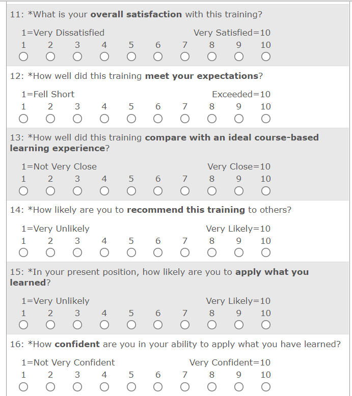 The actual survey appears as one web page; this enables the respondent to view the entire set of questions except the questions that appear only when a specific option is selected. The pagination of this document accommodates the screen capture images.