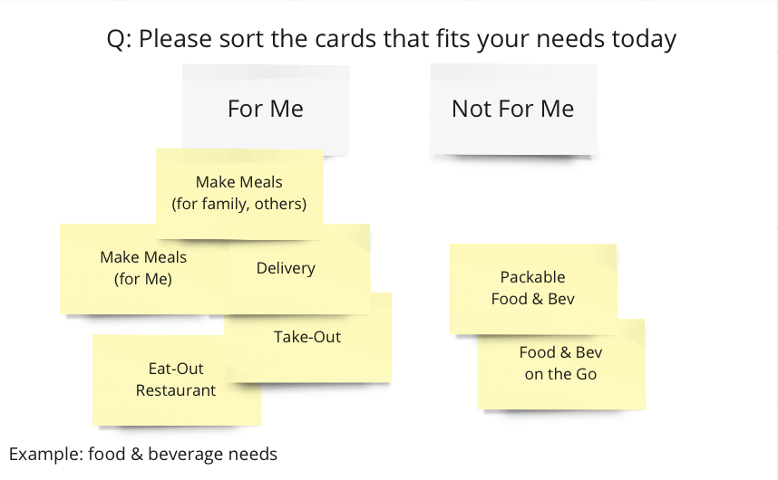 Ask: Using the cards, can you please sort into two categories: ‘For Me’ (things that are relevant to your needs today) and ‘Not for Me.’