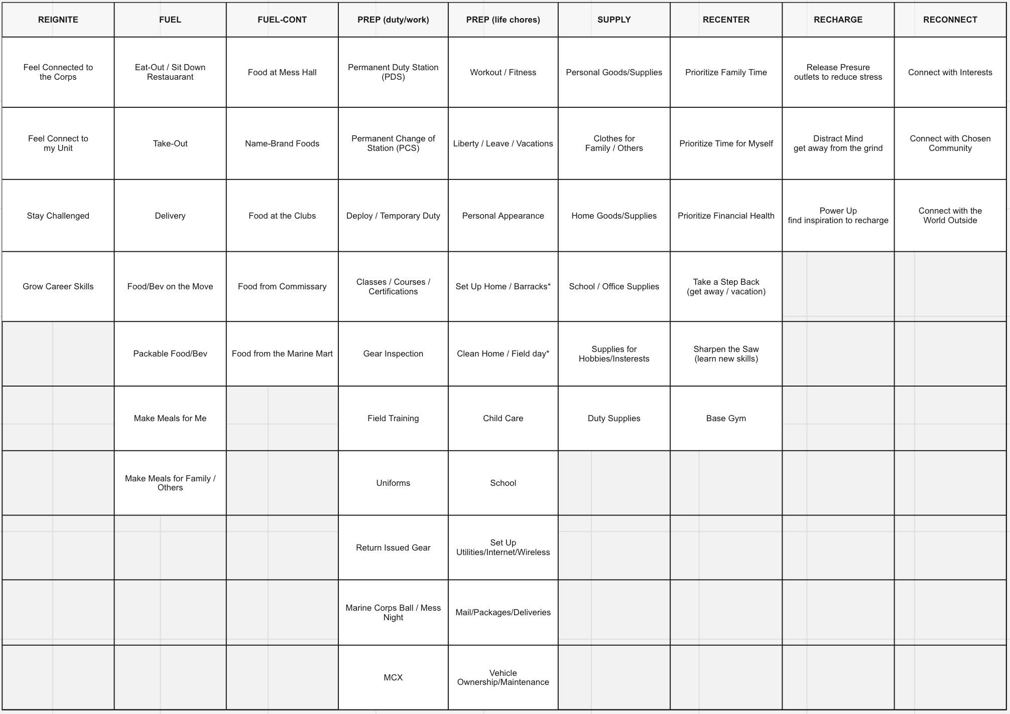 Hi, I’m [name] and I’m from a consulting firm that’s been hired by Marine Corps Community Services to better understand your lifestyle and the activities that make up your day, week, or even year for that matter. It’s through this and many other similar conversations that we’ll gather and analyze the truths that we hear so that we can help the Marine Corps provide better solutions that will improve your quality of life in both small and more meaningful ways. We will be saving your responses by generic identifiers, not your name, and to protect your confidentiality, please do not provide your personally identifiable information (PII) in your responses.