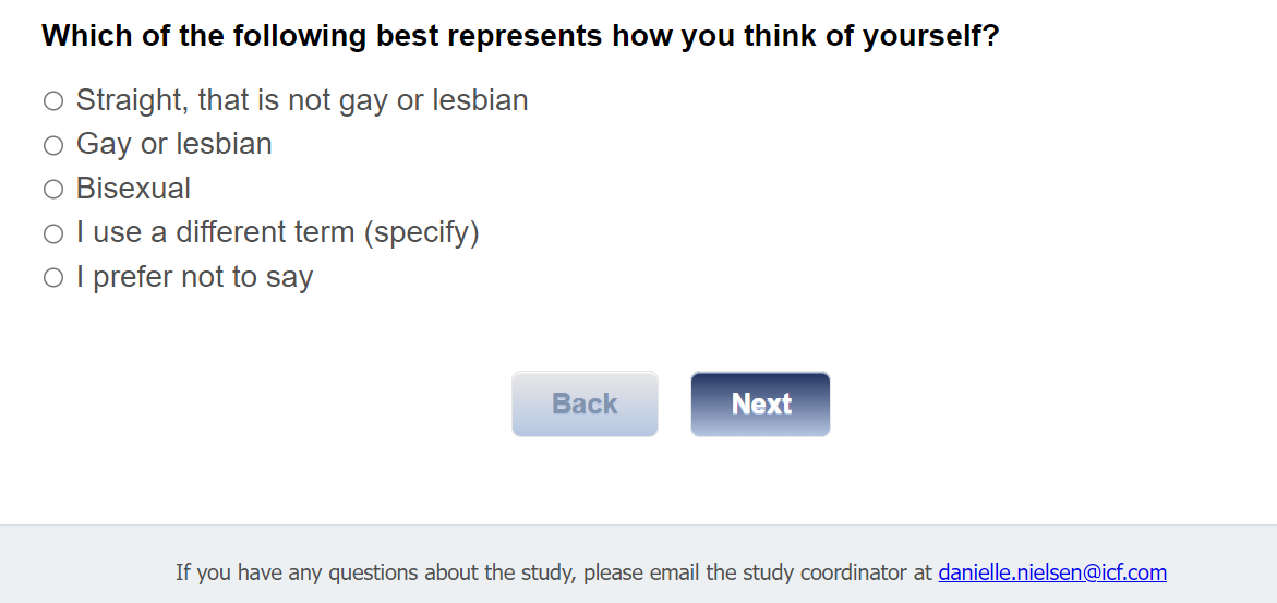 Today, we are screening people for eligibility for this study. Your participation in this screening process is completely voluntary and requires 5-8 minutes of your time to answer questions. Your answers are completely anonymous and confidential. If you meet the eligibility criteria outlined for this study, you will immediately be asked to complete a brief survey. Please reach out to Danielle Nielsen, ICF project manager, with any questions before, during, or after completing this screener.