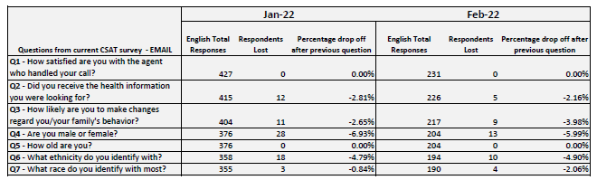 In addition, below is a table that shows drop-off rates for the questions in the e-mail survey. Ethnicity and race questions, in that order, are the last two questions in the survey. As you can see from the table, in January, for example, total of 6.93% of respondents that answered the previous question dropped off as the race and ethnicity questions were asked (English survey). In February that number was 5.99%. Comparative drop-off rate for all demographic questions (sex, age, ethnicity, race) were 12.56% in January and 12.95% in February. For the 3 non-demographic questions (Q1-Q3), total drop-off was 5.46% in January and 6.14% in February. Note the e-mail instrument allows for all questions to be optional and there are 2 open-ended questions (Q2a and Q3a) that the respondents can choose not to respond or skip. There is also a third question (Q3b) that allows for multiple responses and an open response that can be skipped. Therefore, the response total pool fluctuates throughout and depends on what the responders decide to answer. Despite the fluidity, these numbers do not necessarily demonstrate that there is excessive or uneven drop-off due to the nature of the ethnicity and race questions.