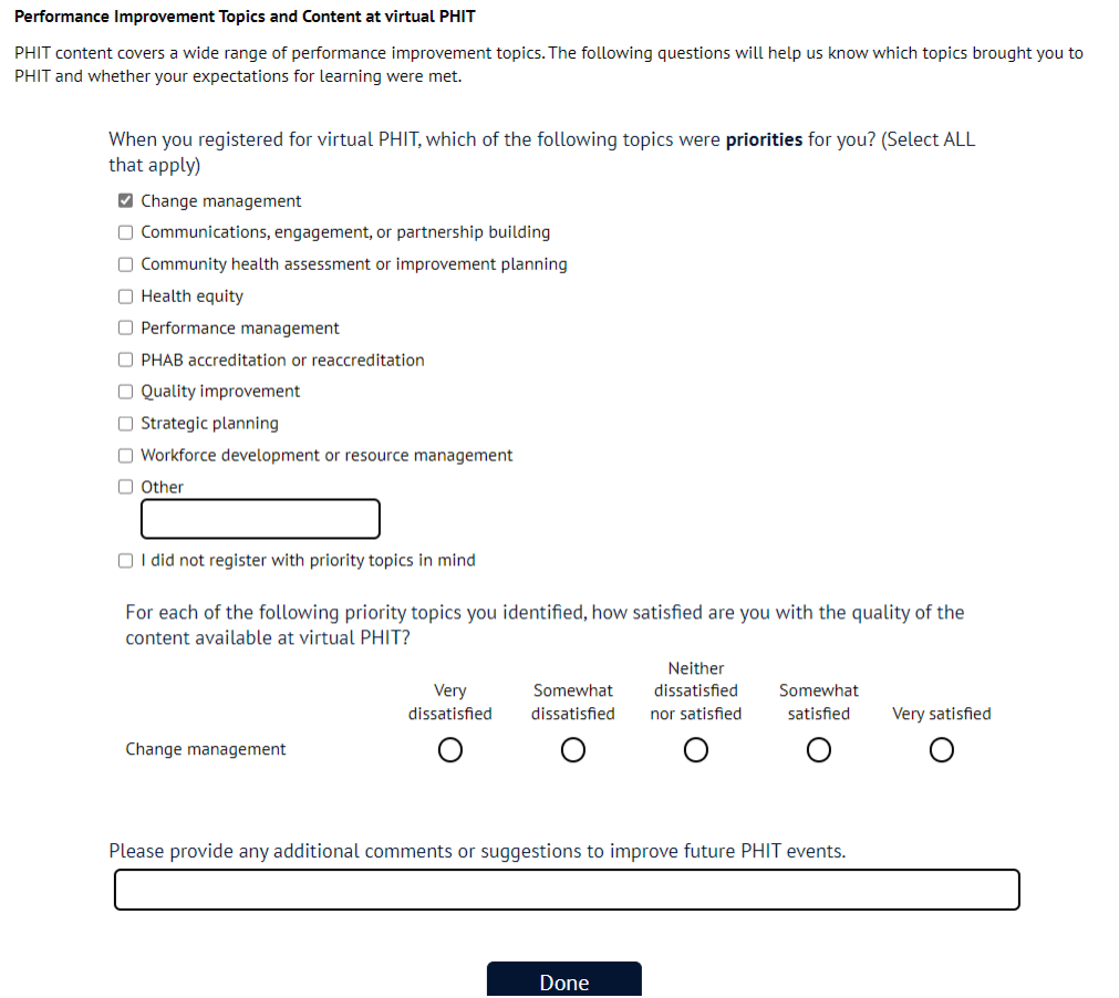 Thank you for participating in this year’s Public Health Improvement Training (PHIT)! Please take a few moments to tell us about your experience at PHIT. We rely on your feedback to help plan and improve future training events. This survey is voluntary and should take about 5 minutes. Your feedback is confidential, and we will not be able to identify you when we receive it.
