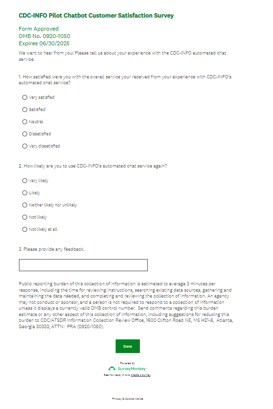 0920-1050 2023 CDC-INFO Pilot Chatbot Customer Satisfaction Survey