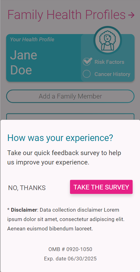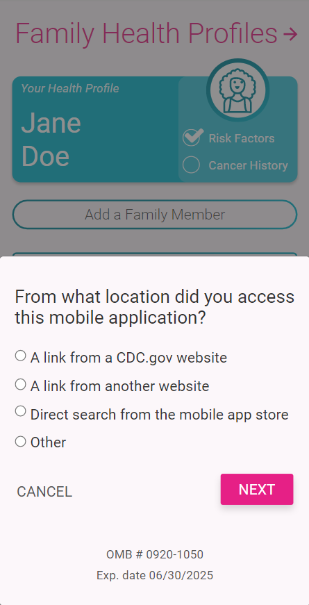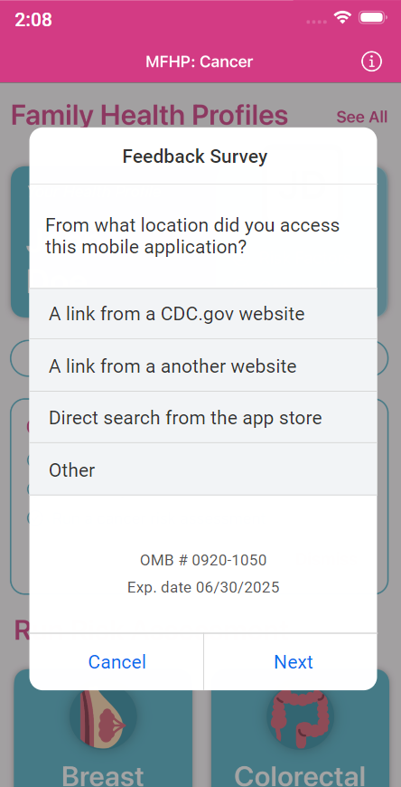 Public reporting burden of this collection of information is estimated to average ½ minute (30 seconds) per response, including the time for reviewing instructions, searching existing data sources, gathering and maintaining the data needed, and completing and reviewing the collection of information. An agency may not conduct or sponsor, and a person is not required to respond to a collection of information unless it displays a currently valid OMB control number. Send comments regarding this burden estimate or any other aspect of this collection of information, including suggestions for reducing this burden to CDC/ATSDR Reports Clearance Officer; 1600 Clifton Road NE, MS D-74, Atlanta, Georgia 30333; ATTN: PRA (0920-1050).