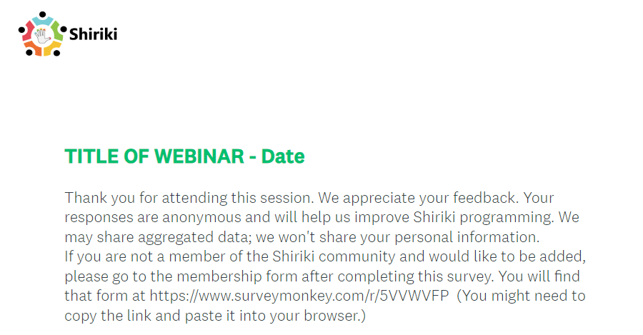 Webinar feedback request form: Responses are anonymous and we do not present the option of self-identification. Instructions include: “Your responses are anonymous and will help us improve Shiriki programming. We may share aggregated data; we won't share your personal information.”