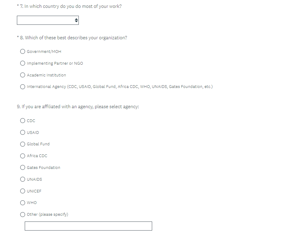 In which country do you do most of your work? [dropdown box of countries; “other” |
