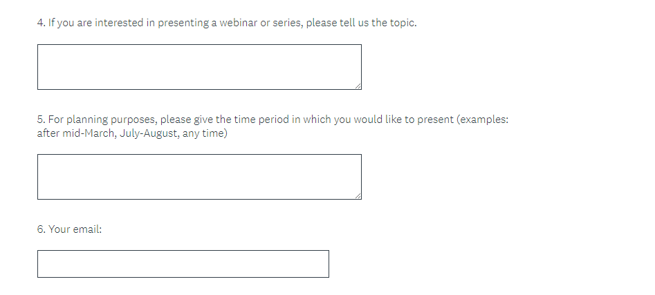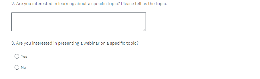 Are you interested in presenting a webinar on a specific topic? [Y/N] If yes: If you are interested in presenting a webinar or series, please tell us the topic. |