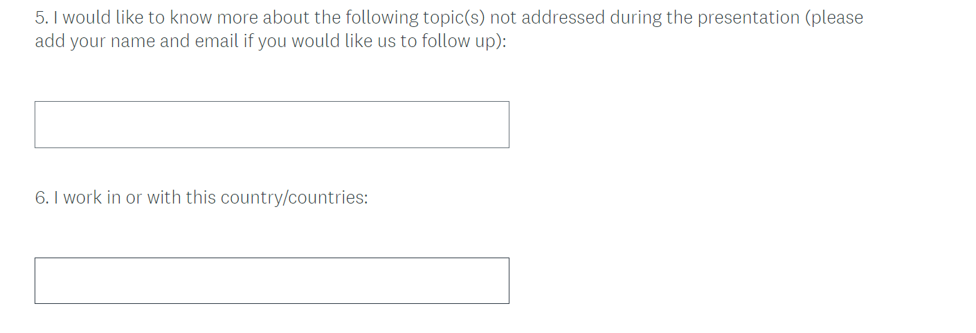 I would like to know more about the following topic(s) not addressed during the presentation (please add your name and email if you would like us to follow up): |