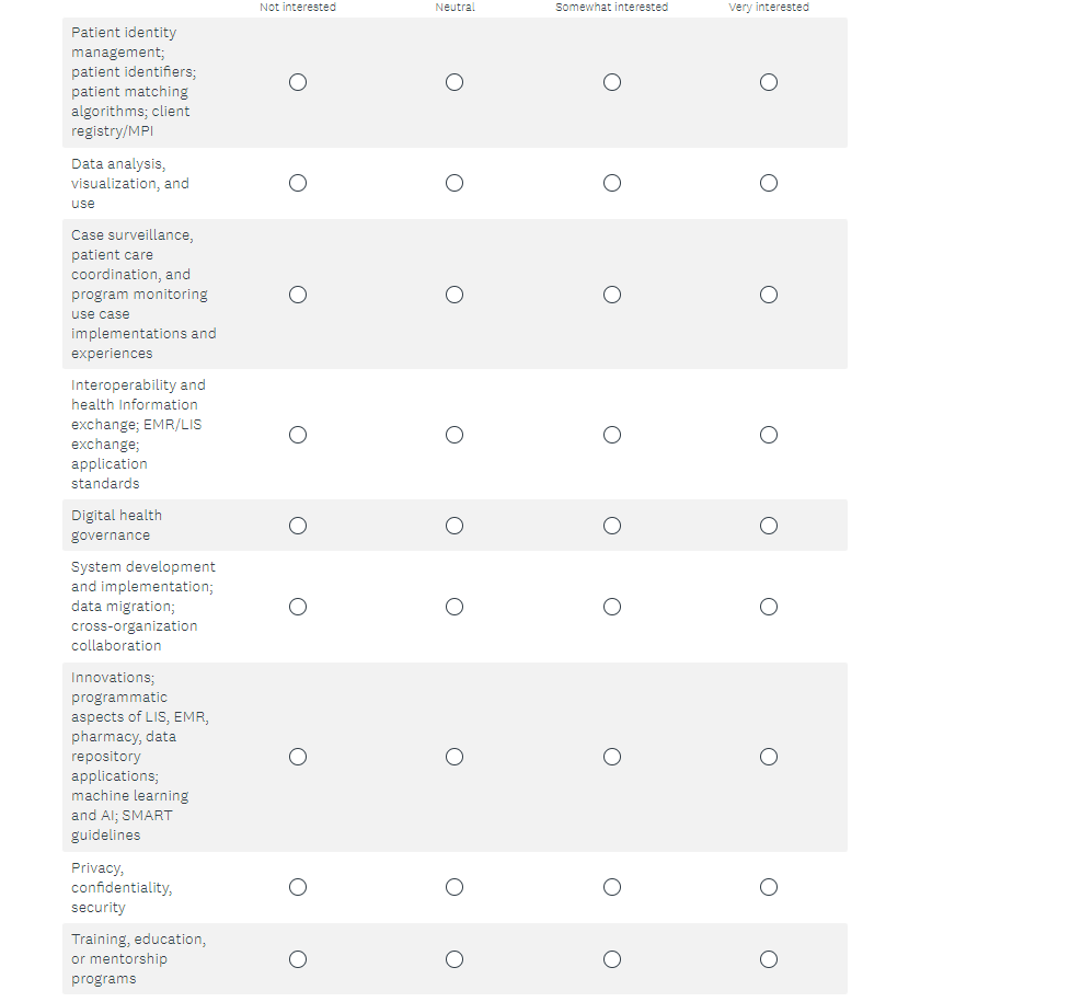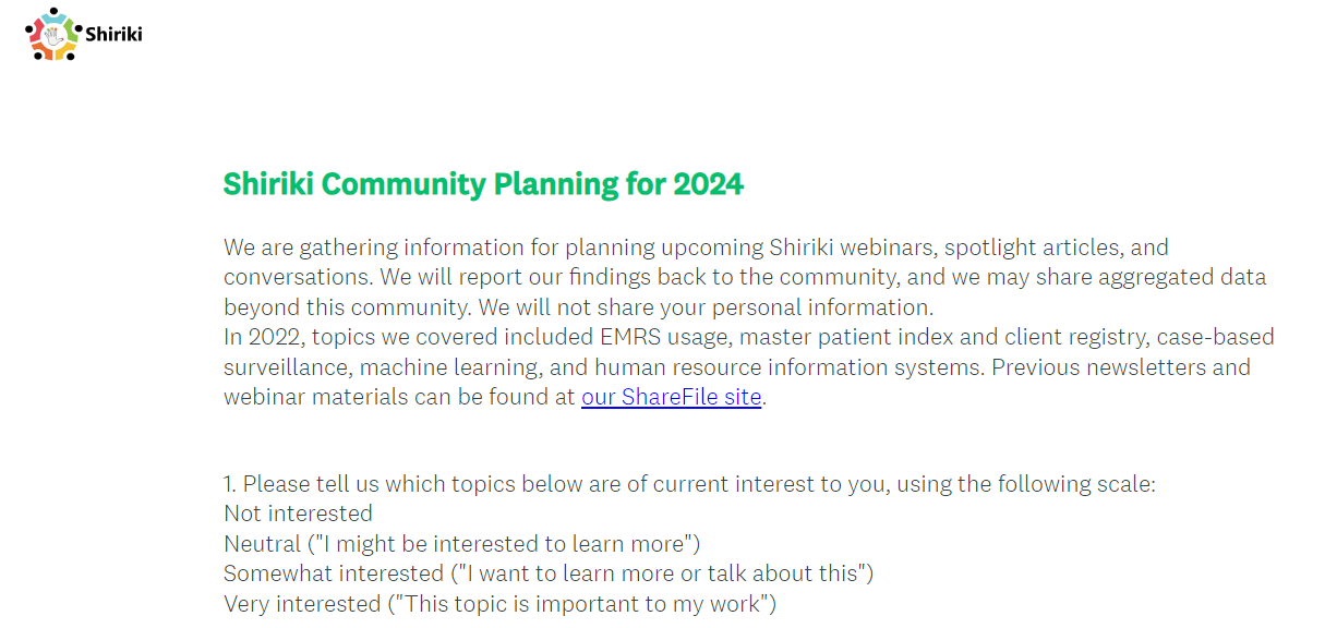 We are gathering information for planning upcoming Shiriki webinars, spotlight articles, and conversations. We will report our findings back to the community, and we may share aggregated data beyond this community. We will not share your personal information. In 2022, topics we covered included EMRS usage, master patient index and client registry, case-based surveillance, machine learning, and human resource information systems. Previous newsletters and webinar materials can be found at our ShareFile site.