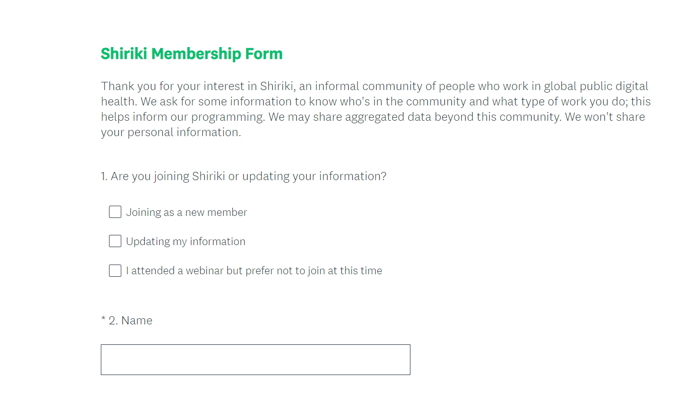 Annual community survey: “We are gathering information for planning upcoming Shiriki webinars, spotlight articles, and conversations. We will report our findings back to the community, and we may share aggregated data beyond this community. We will not share your personal information.” If respondent indicates they would like to present on a particular topic, there is an optional question for name and email. We use that information to follow up with respondent and invite them to schedule a webinar.