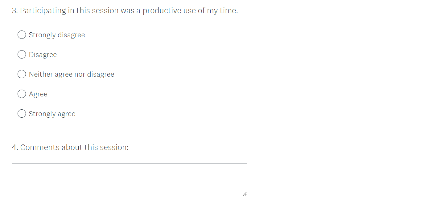 We distribute to the members a survey (Table 3, Appendix 3) for members to evaluate usefulness of the community and offerings and to make suggestions for programming. This survey is anonymous although we request that participants who suggest a future webinar topic include name and email for follow up.