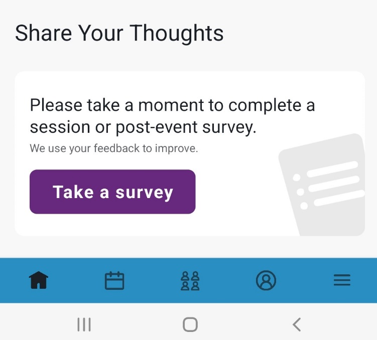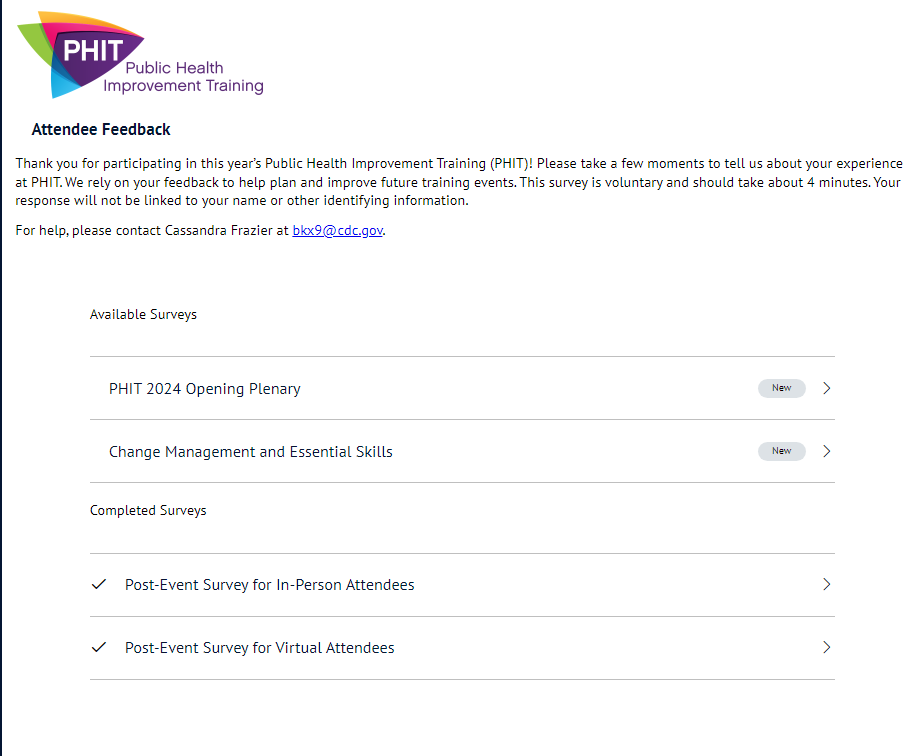 Screenshot of PHIT event Web application home screen button that redirects to attendees’ centralized survey landing page: