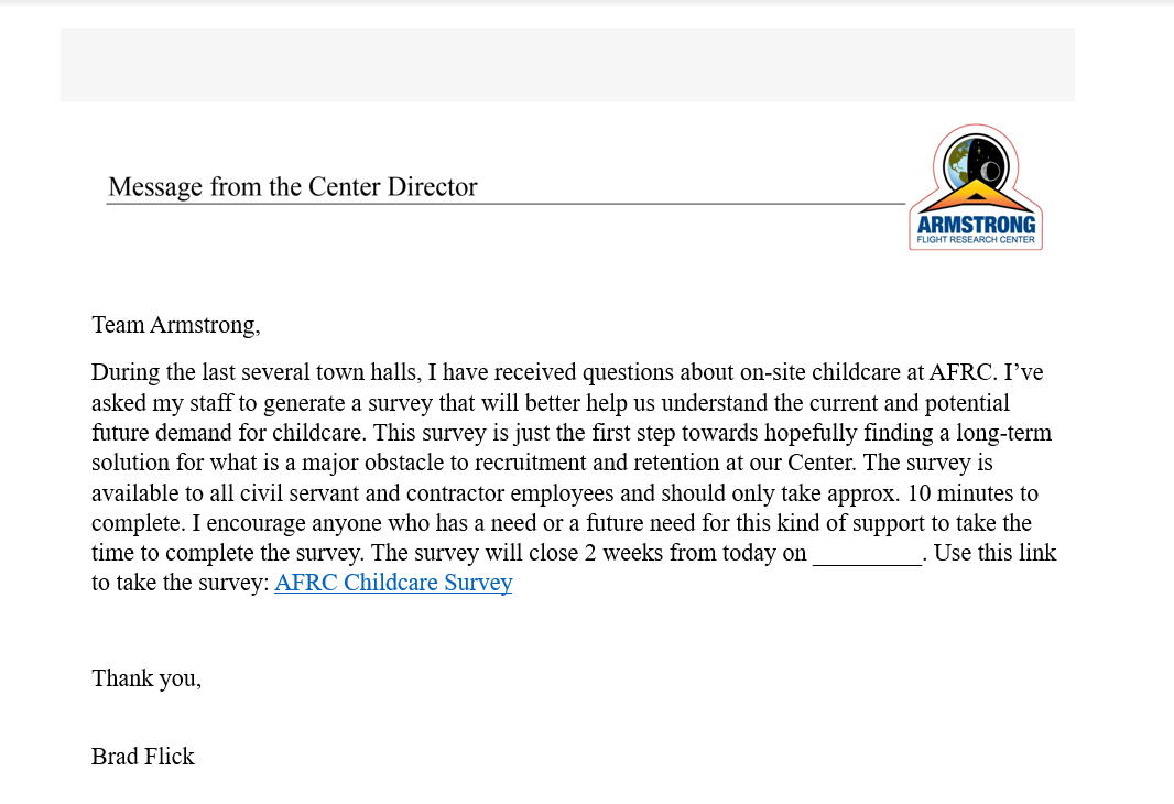 The survey would be posted on our internal NASA Armstrong site, Inside Armstrong, under Center Announcements: