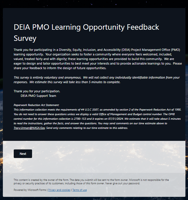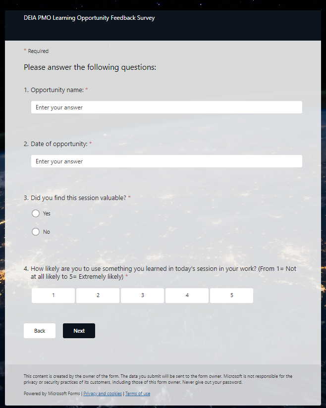 Screen shots of DEIA PMO Learning Opportunity Feedback Survey