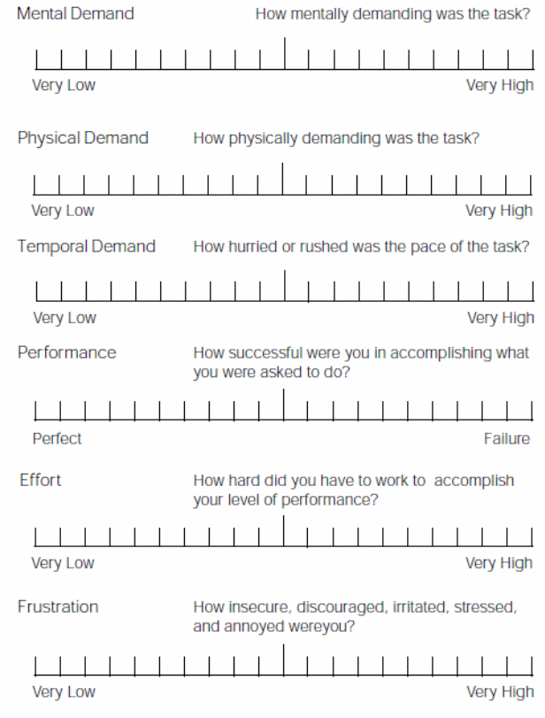Hart, S. G., & Staveland, L. E. (1988). Development of NASA-TLX (Task Load Index): Results of empirical and theoretical research. In Advances in psychology (Vol. 52, pp. 139-183). North-Holland.