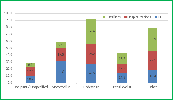 Values are shown as percentages | Occupant / Unspecified | Motorcyclist | Pedestrian | Pedal cyclist | Other | |||||||