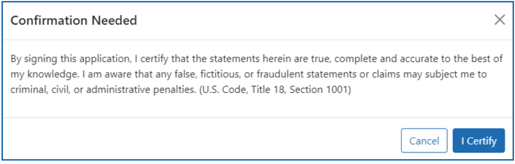 A pop-up confirmation message appears. The IO needs to click the I Certify button to verify that the statements are true and complete the submission. Once it is fully submitted, both the IO and the PI and other persons listed in the application will receive a confirmation email.