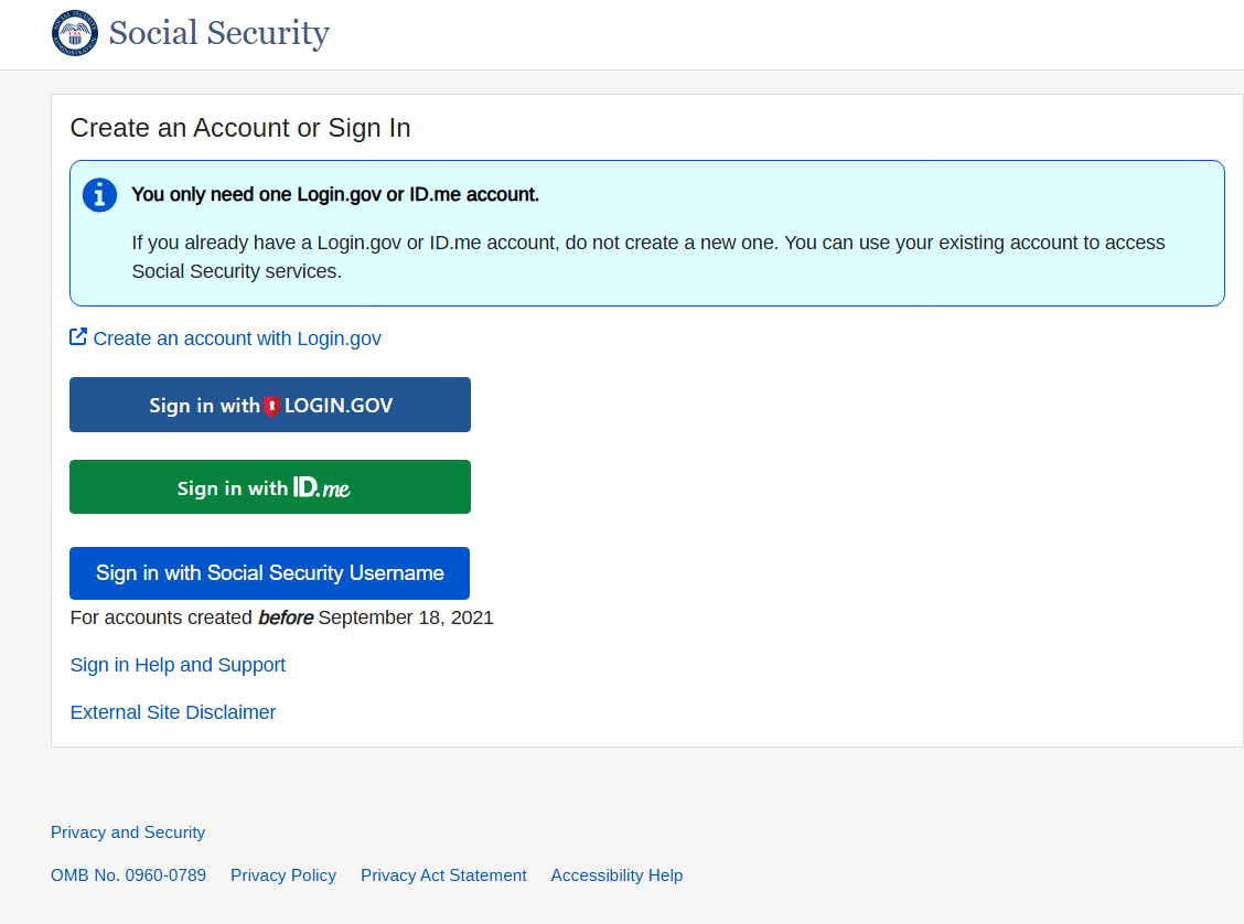 User signs in to their mySocialSecurity account via traditional URL using their Login.Gov or ID.me credential