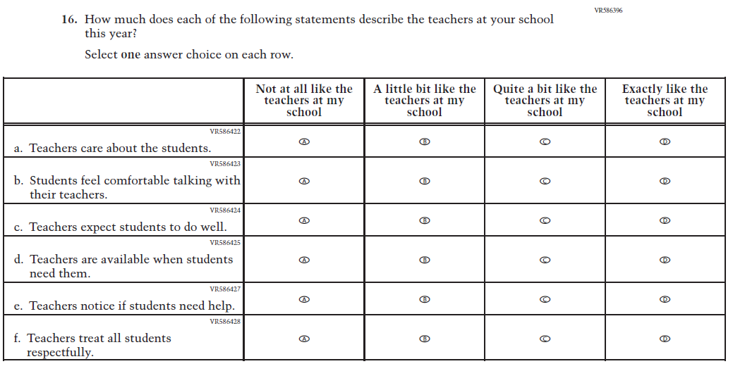 For 2026, we have aligned Inline Directions in Teacher and School Items with the Directions currently used in Student Items. Also, in SubItem g. “English-language learners” was updated to “English learners” to be consistent with other Items. |