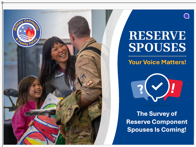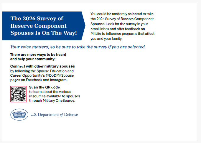 I recently contacted you about an opportunity to share your experiences via the 2026 Reserve Component Spouse Survey. Thank you for completing this Department of Defense survey if you have already done so. If you missed it, or perhaps you haven’t submitted your answers yet, please do so as soon as possible!