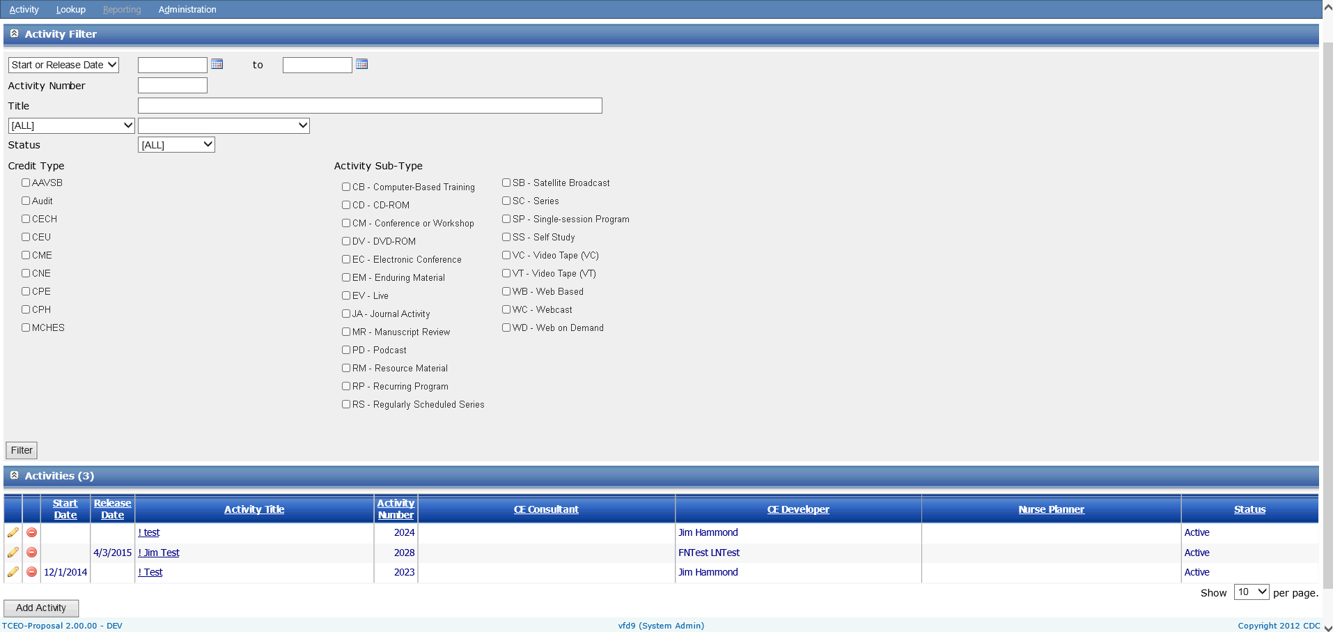 Figure 3 – Activity Filter/ Selection Page