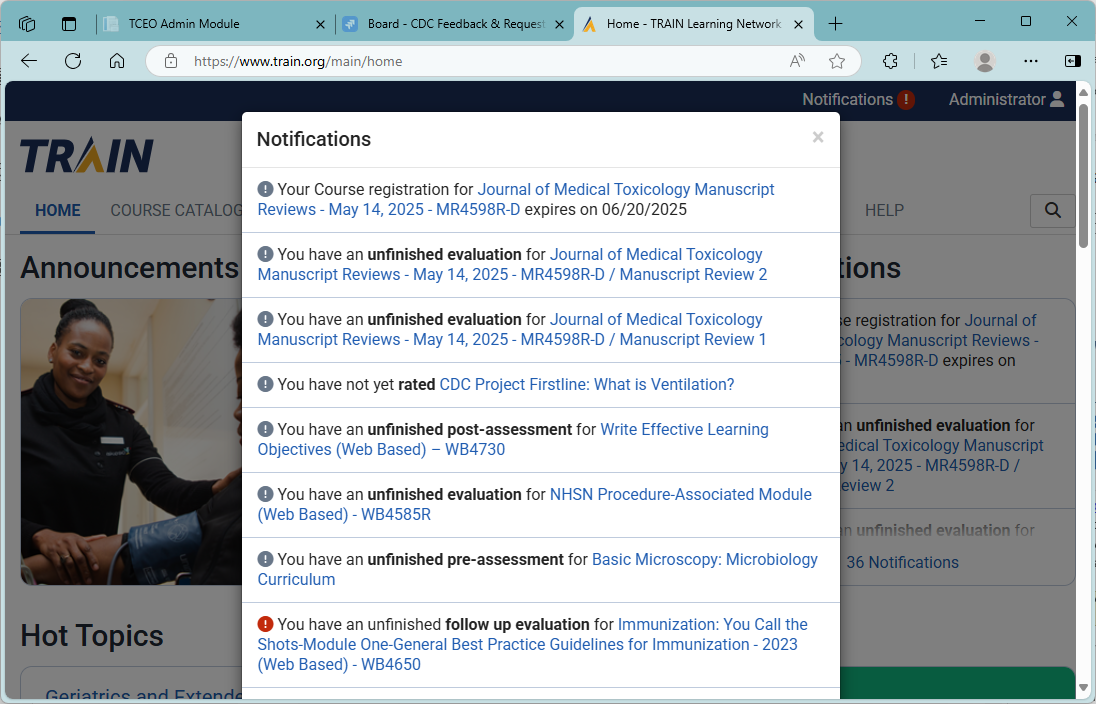 CDC TRAIN Evaluation Reminder Notifications (displayed when users log into the CDC TRAIN platform)